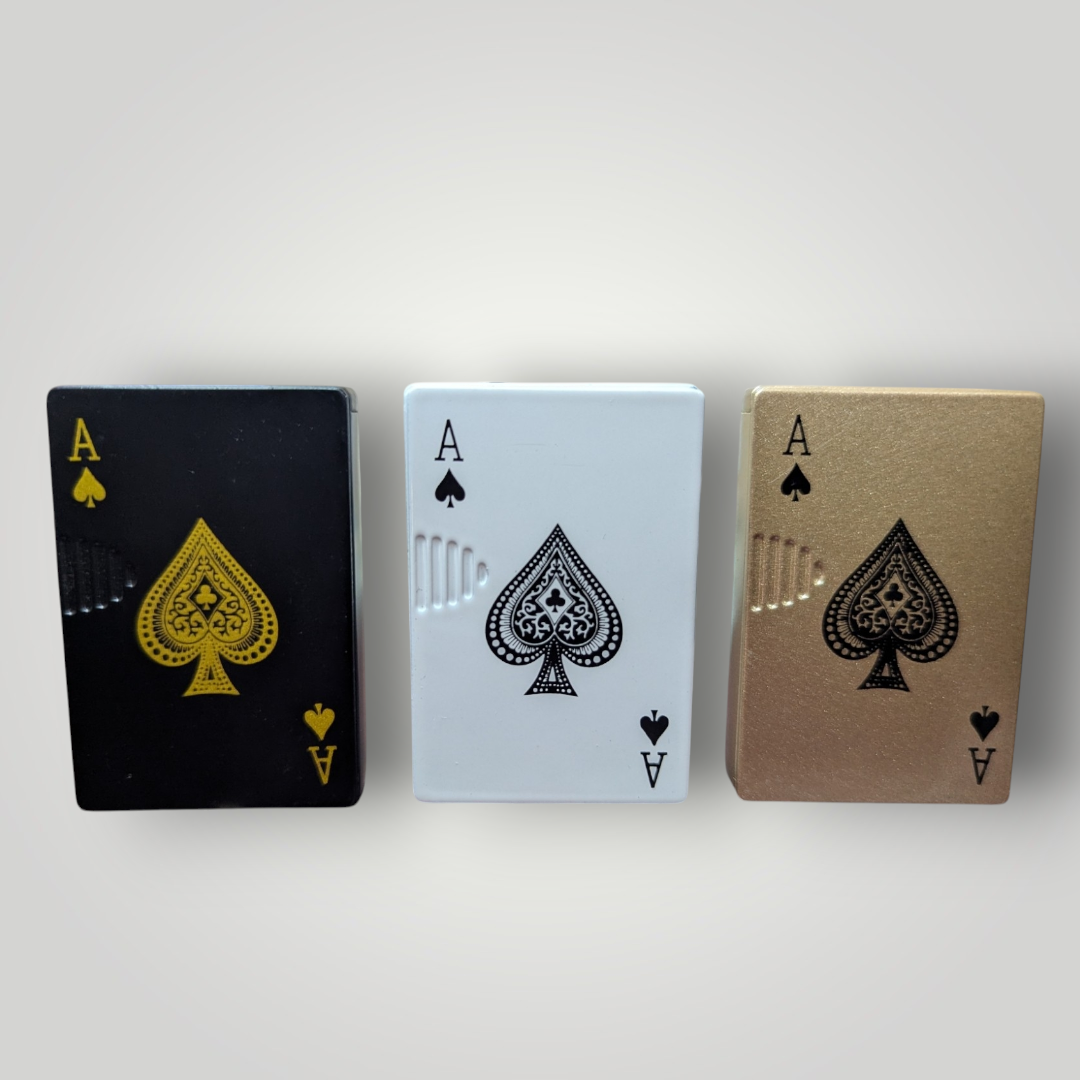 The Playing Card Ace Lighter features a sleek, full metallic body designed for durability and style. Available in four distinct colors, it stands out with a vibrant green jet flame that ensures a strong, consistent ignition. Perfect for collectors and enthusiasts, this lighter combines functionality with a unique aesthetic inspired by the iconic ace playing card.